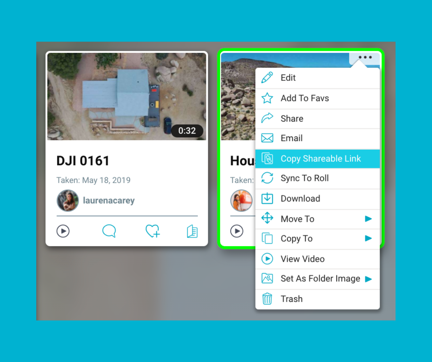 Start by saving all the images, videos, or documents into one folder. From inside the folder, go to the menu on the top-left and hit “Roll an Instant Web Page”. From there you can add a title, description, and customizable image. Once the Roll has been completed, share the URL in a text, direct message, or email.