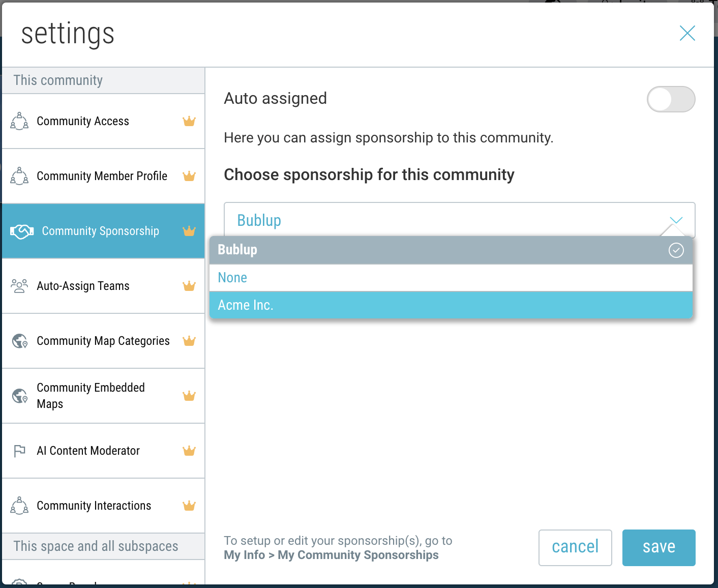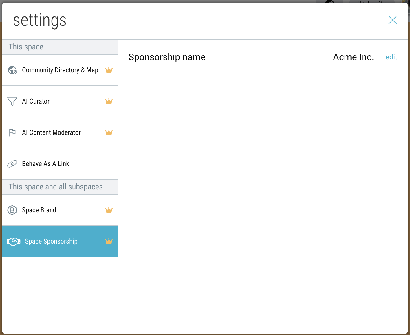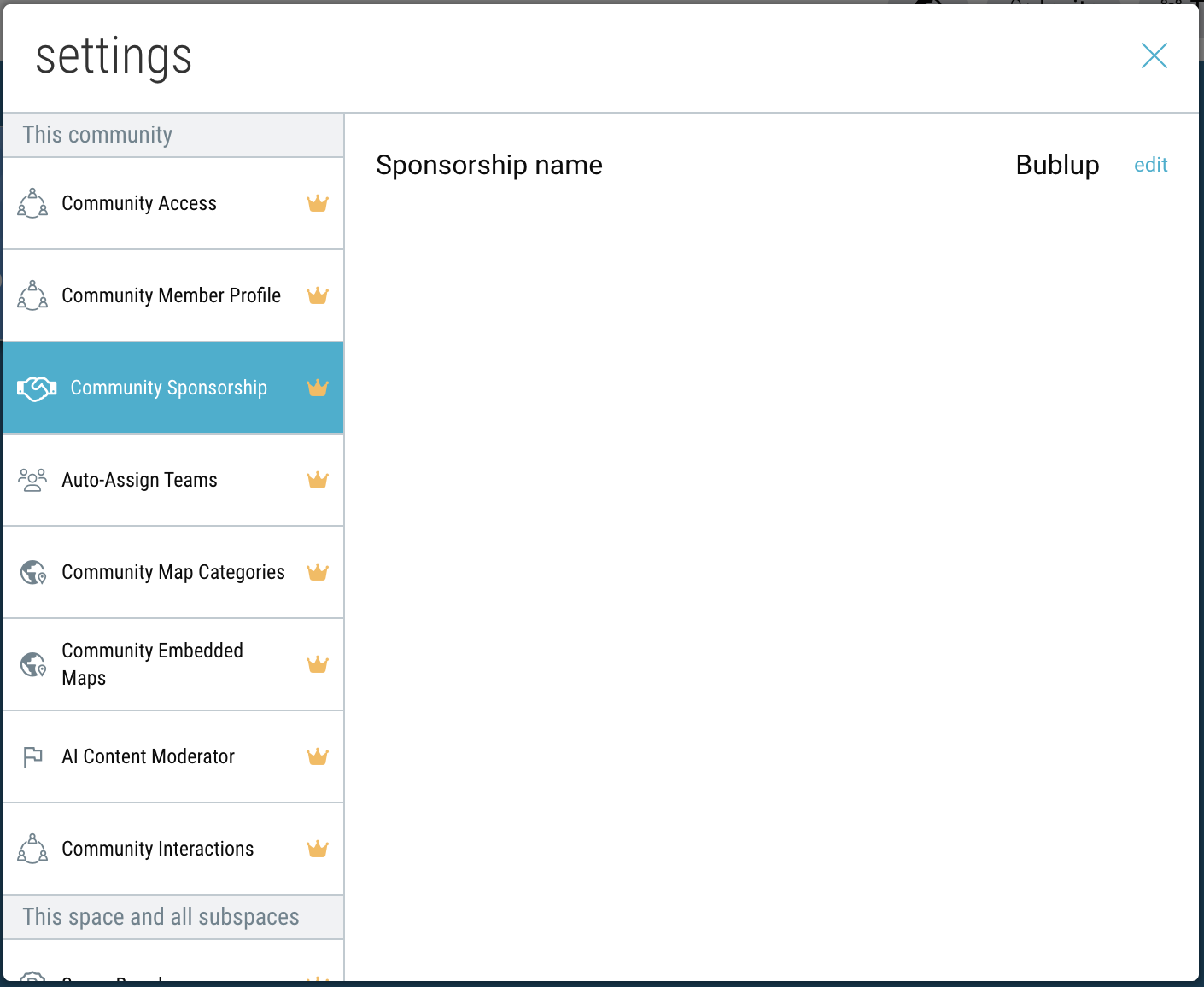 5. By default, all subspaces of your community will inherit the same community sponsorship. To set a different sponsorship for a specific subspace, navigate to that space and click the Settings” icon → “Space Sponsorship”. Then click “edit” and select a different sponsor.