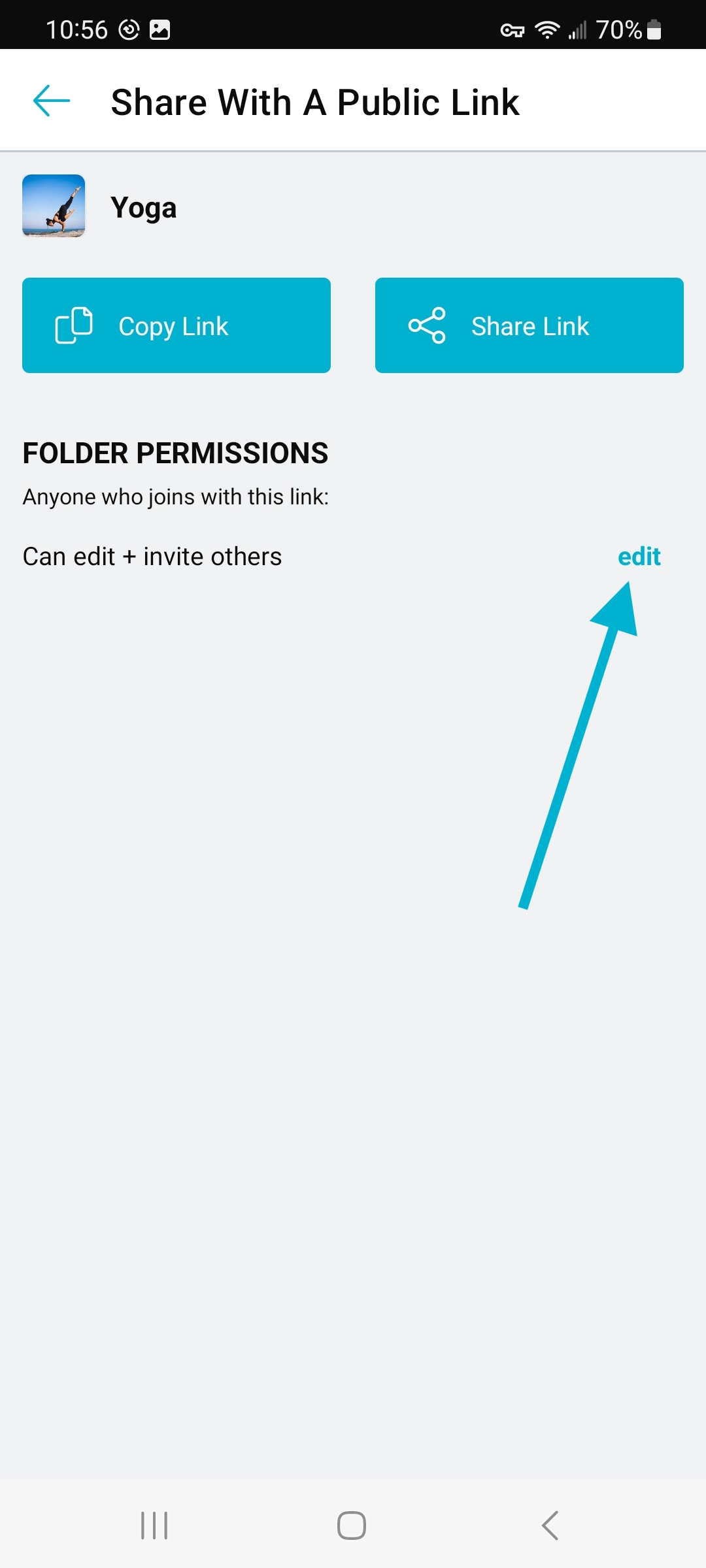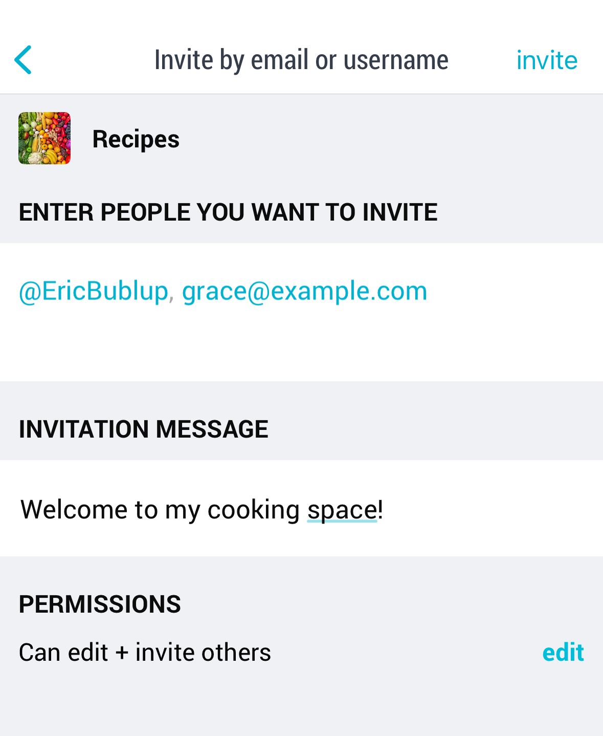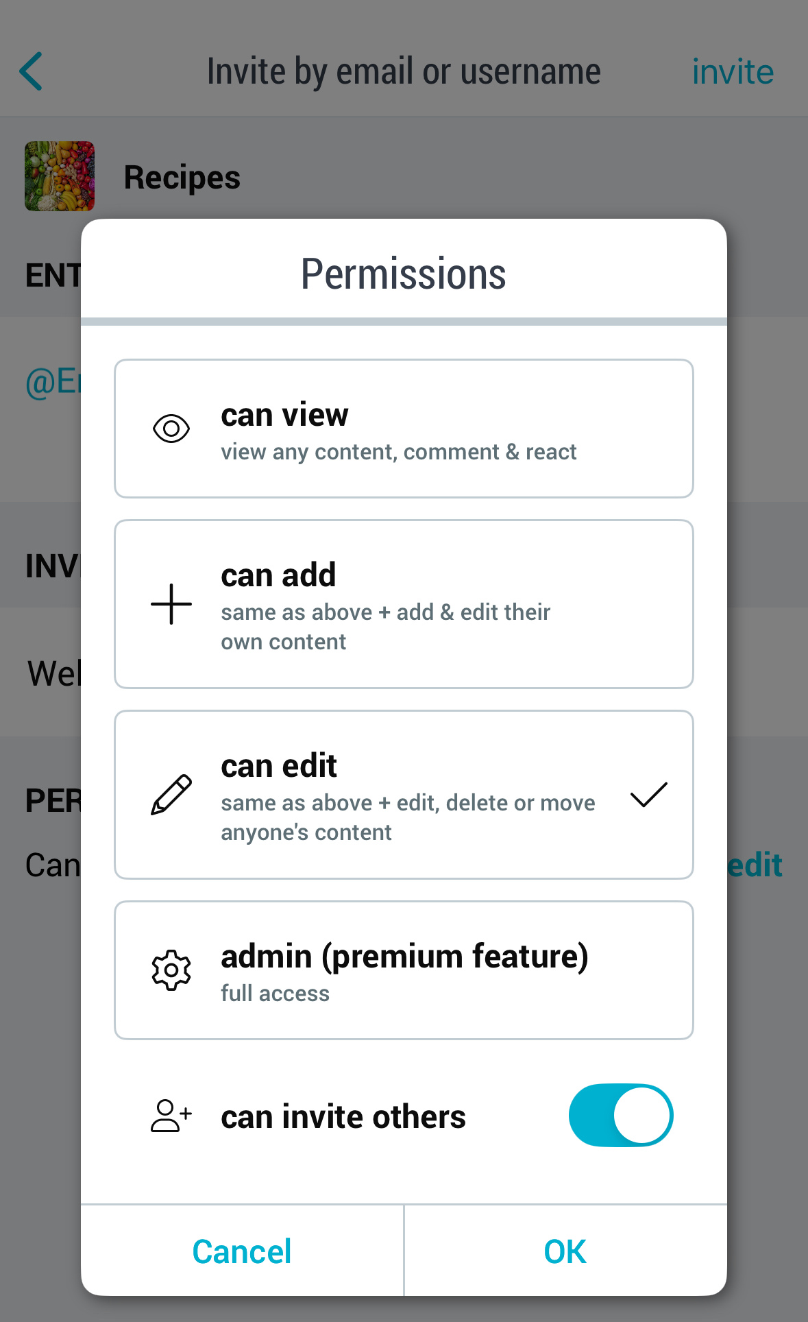 i. Choose the permissions for new members by tapping “Edit”. (See below for a detailed description of permissions.) By default, the invitation will have “can edit” permissions.