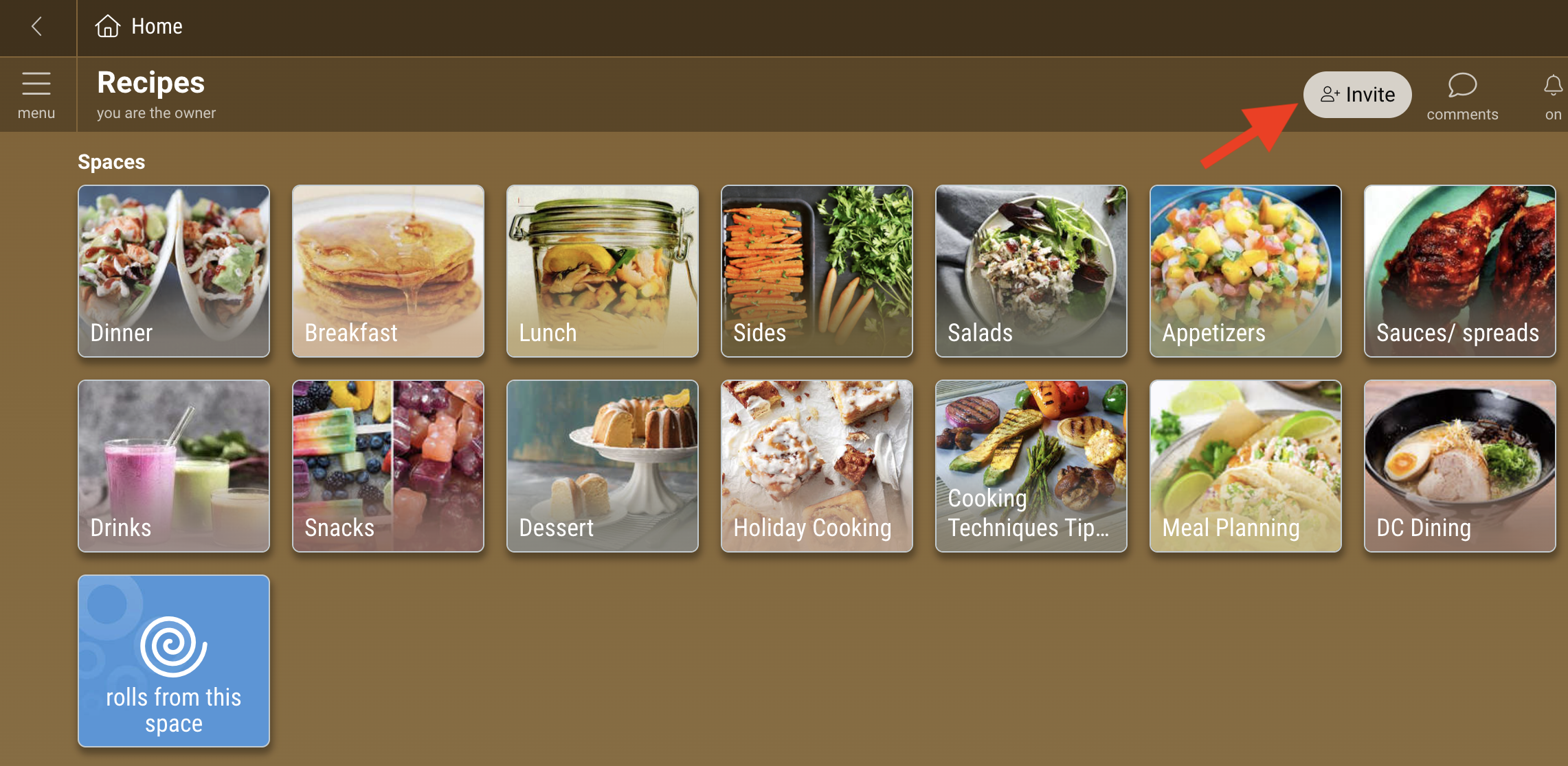 1. When inside a space, click on the “invite” button in the upper-right corner. From outside a space, click on the 3-dot (…) menu and select “Invite”