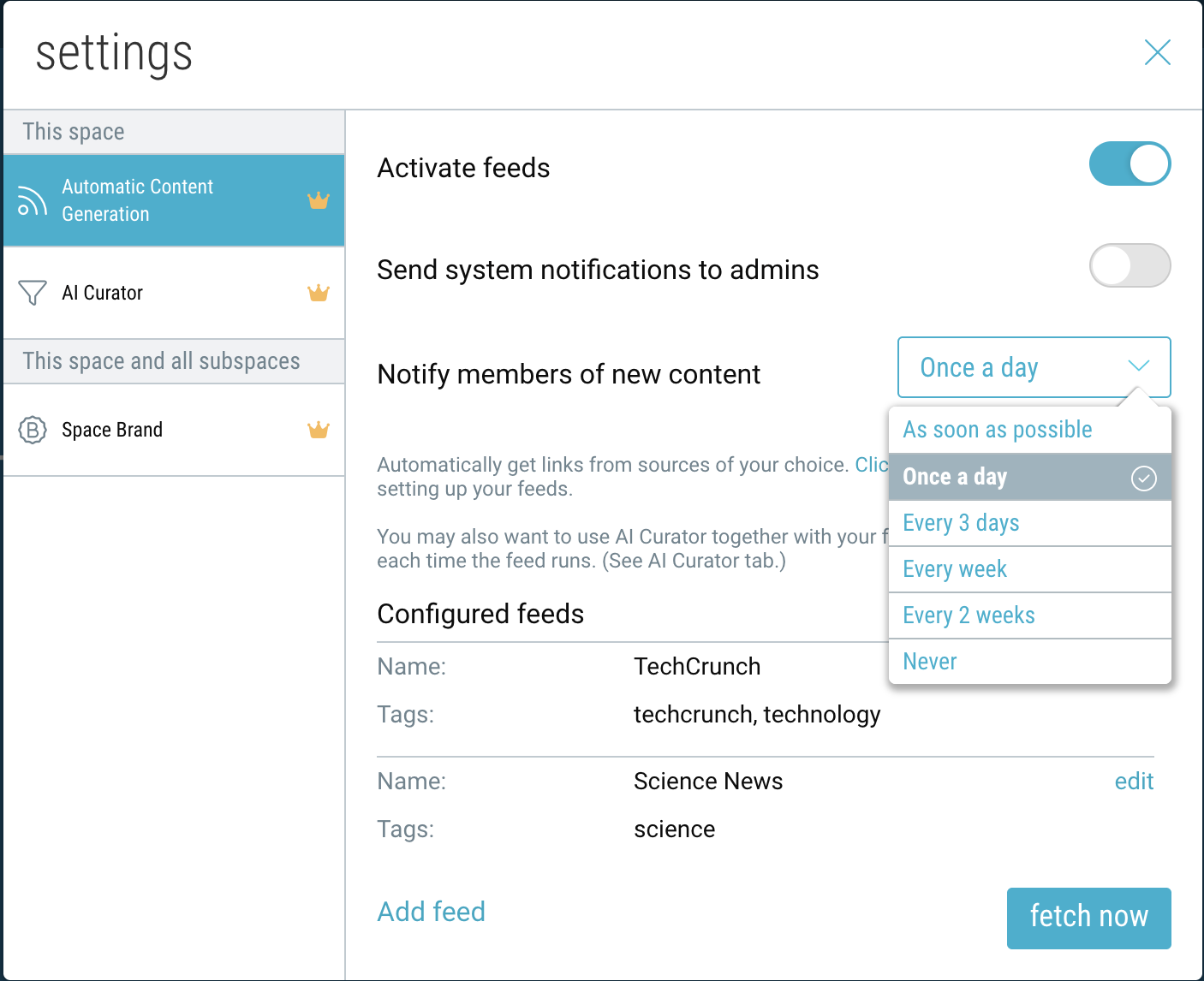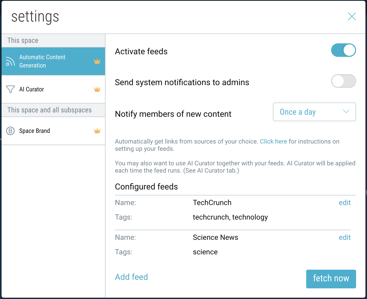 - To automatically filter content from your feeds, enable the AI Curator by navigating to that settings tab.