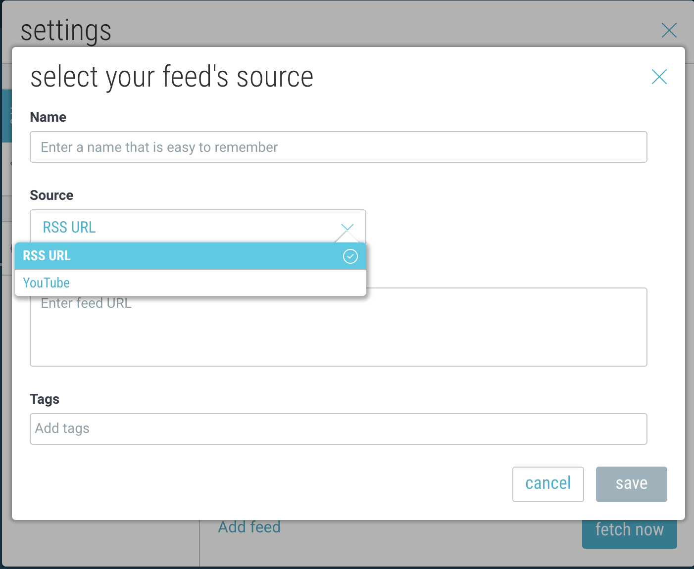 2. This space can combine feeds from multiple sources. To set up the first feed, give it a name and select the source type: RSS or YouTube.