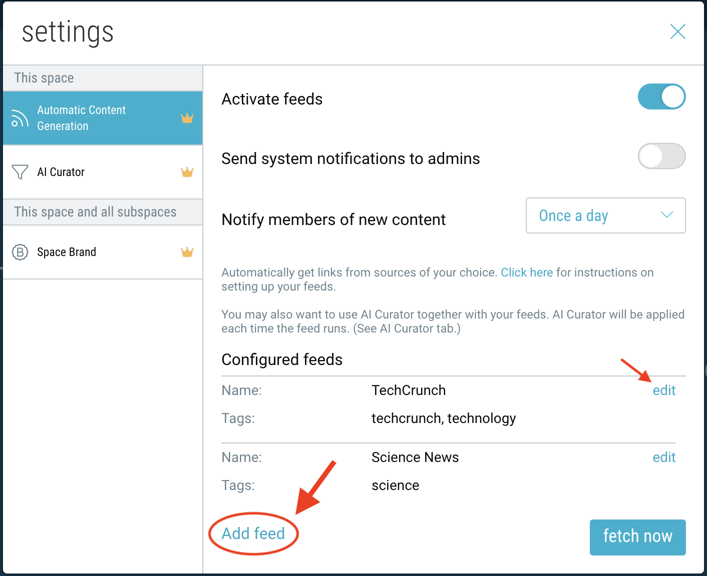 - To add multiple RSS feeds to the same folder, click “Add RSS feed”. To edit or remove an existing feed, click “edit”.