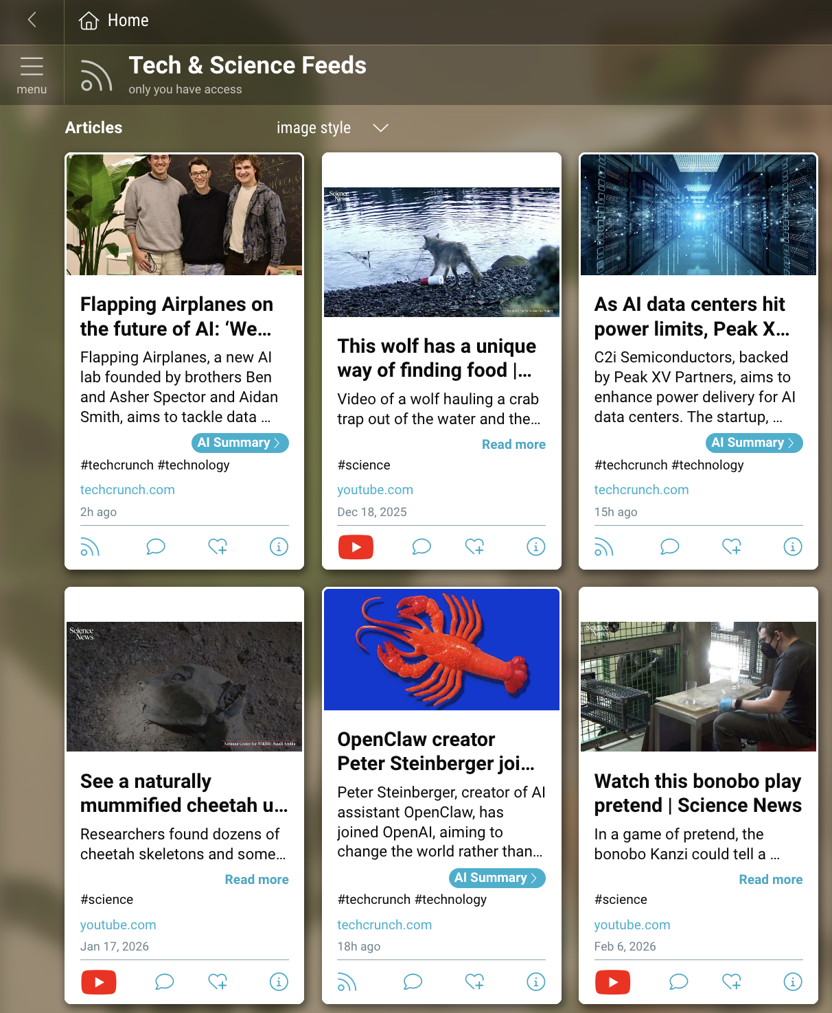 Feeds are an easy way to stay up to date with your favorite websites, such as blogs or podcasts. Automatically populate your Feed spaces with new links from RSS and YouTube sources of your choice.
