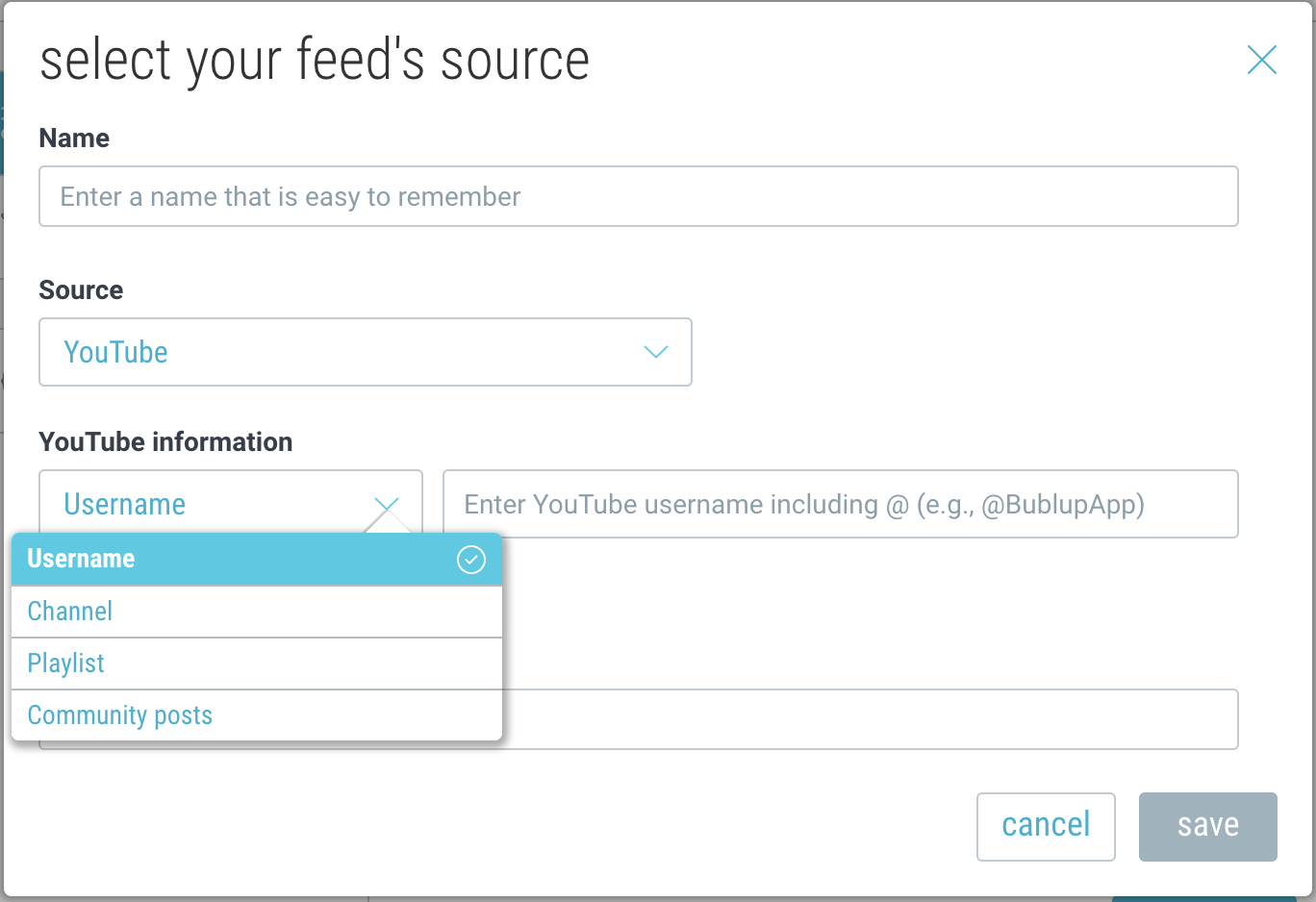 4. If you select “YouTube“, choose between Username, Channel, Playlist, or Community Posts, and enter the corresponding ID or handle. You can also optionally filter out YouTube “shorts”.